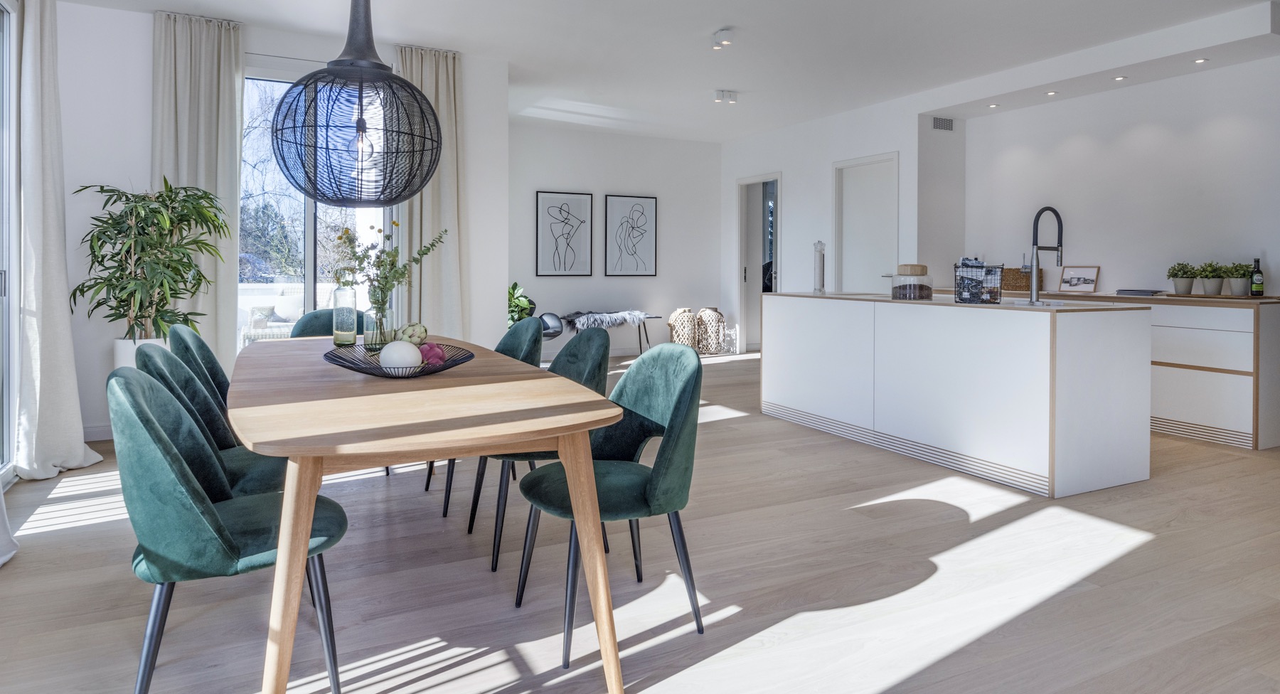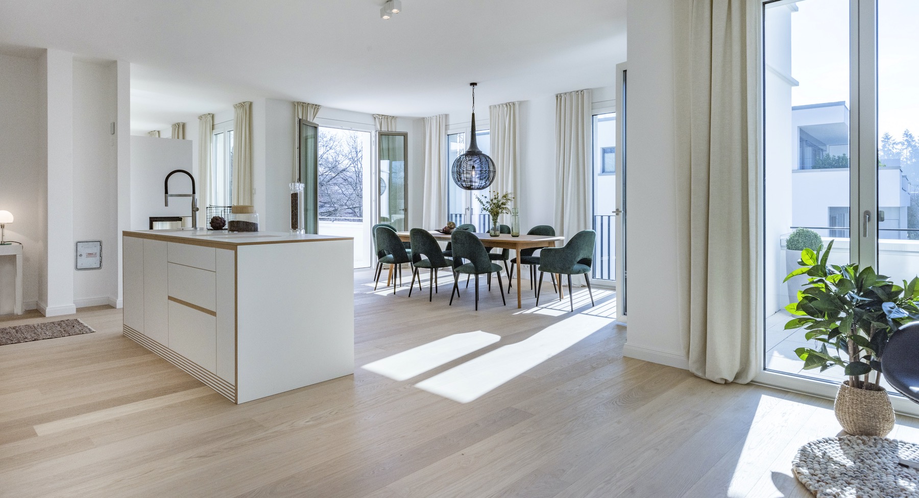 Die hochwertige Erscheinung des Ensembles spiegelt sich auch in der Innengestaltung wider: Neben einem umfangreichen Ausstattungspaket eröffnen großzügige Balkone und Loggien sowie Penthäuser mit Dachterrassen Perspektiven ins Grüne und runden das exklusive Gesamtkonzept ab. Darüber hinaus bietet das Wohnensemble eine Tiefgarage mit 42 Stellplätzen.