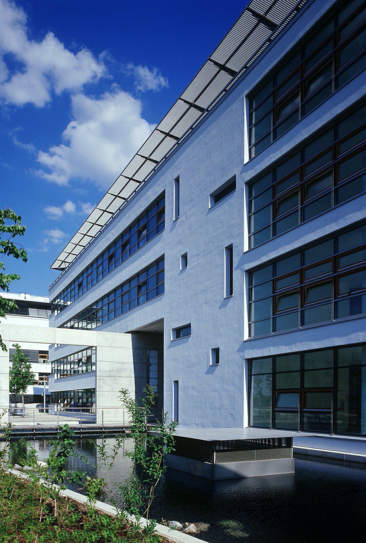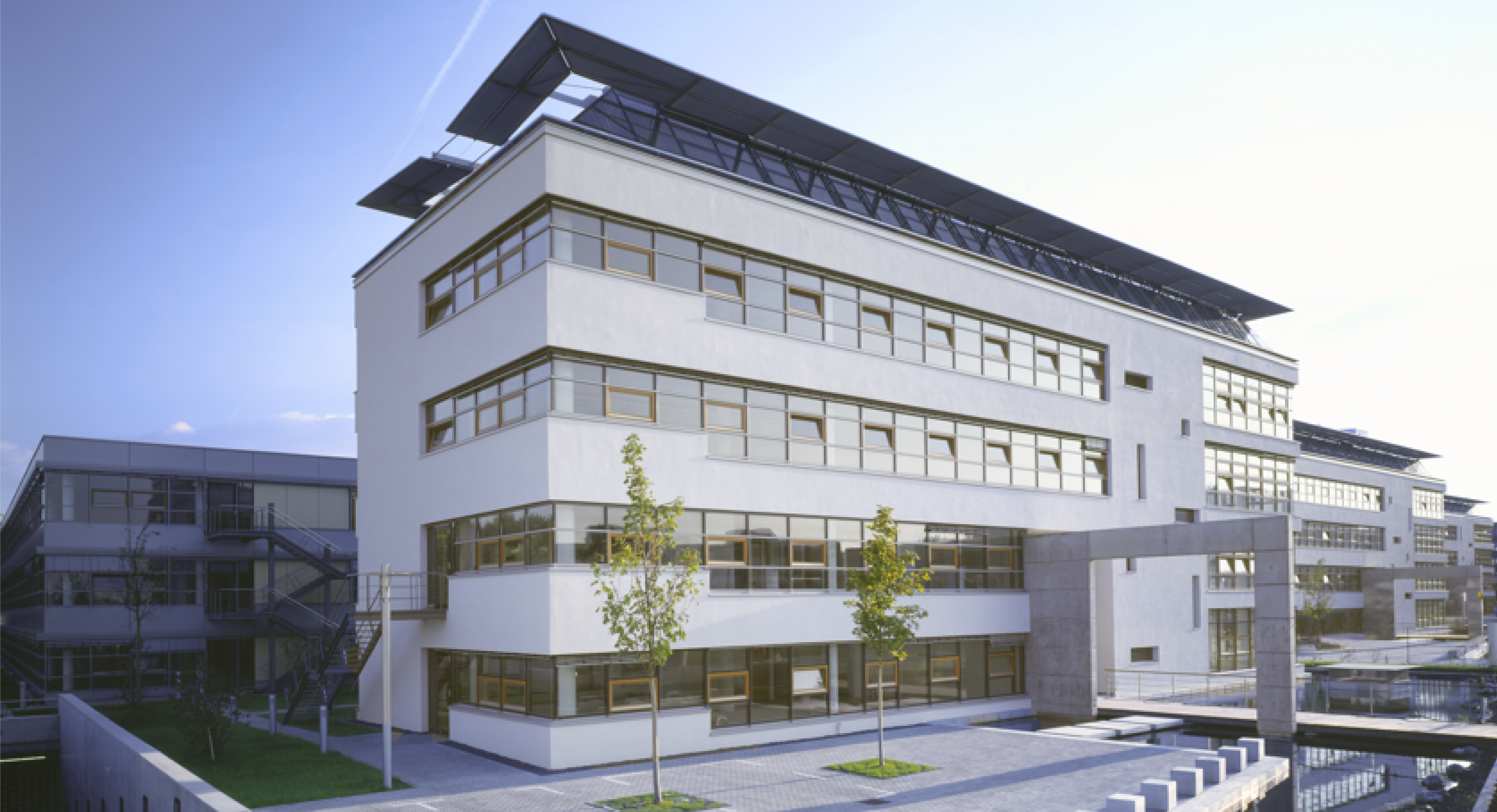 Ein hoher Glasanteil in Kombination mit Holz- und Aluelementen sorgt für einen modernen Fassadenlook und auch die Innenausstattung mit Hohlraumböden und fußbodenebenen Einbaueinheiten schafft ideale Bedingungen für den Arbeitsalltag.