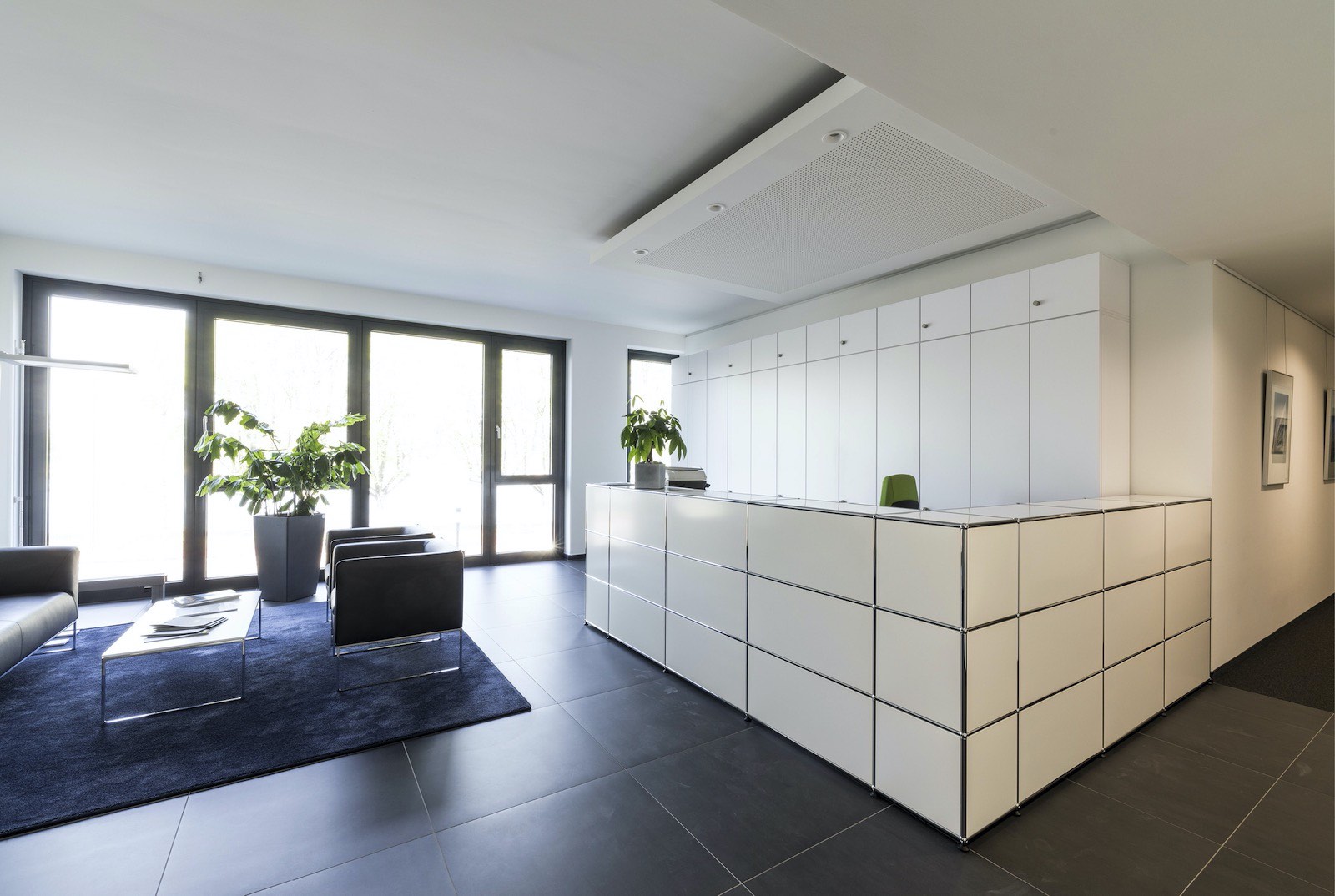 Trotz dieser ungewöhnlichen äußeren Form sind die Grundrisse von eindrucksvoller Ökonomie sowie Flexibilität und ca. drei Meter hohe Decken in den Büroräumen sowie bodentiefe Fenster sorgen für eine luftige Atmosphäre am Arbeitsplatz.