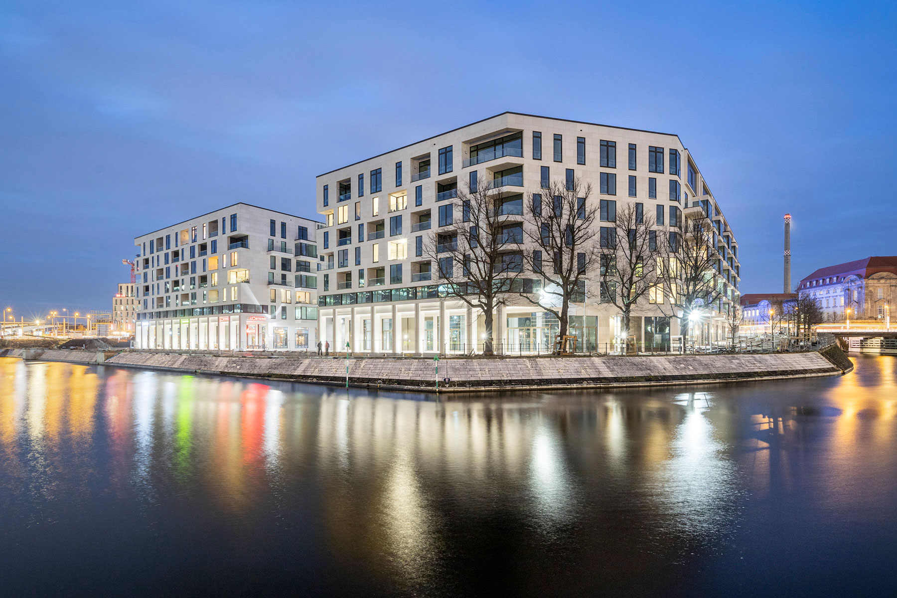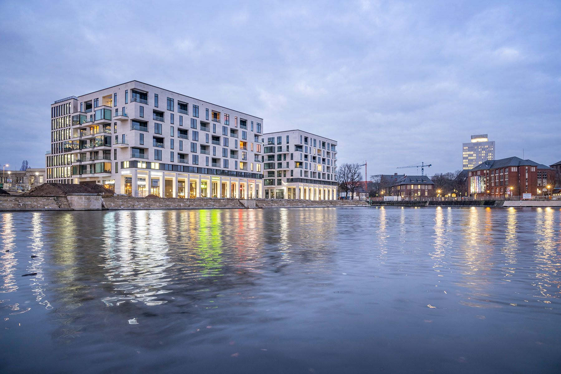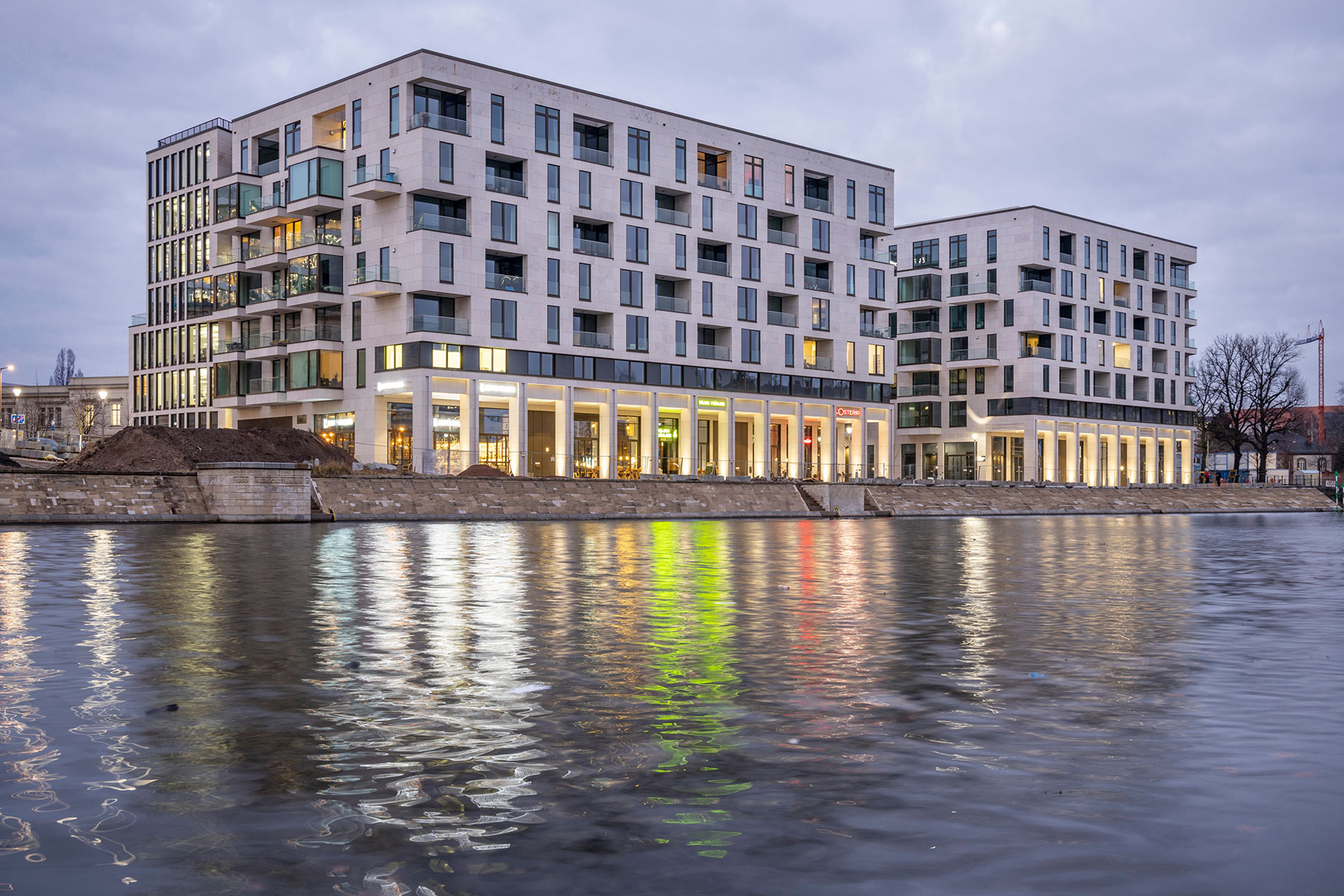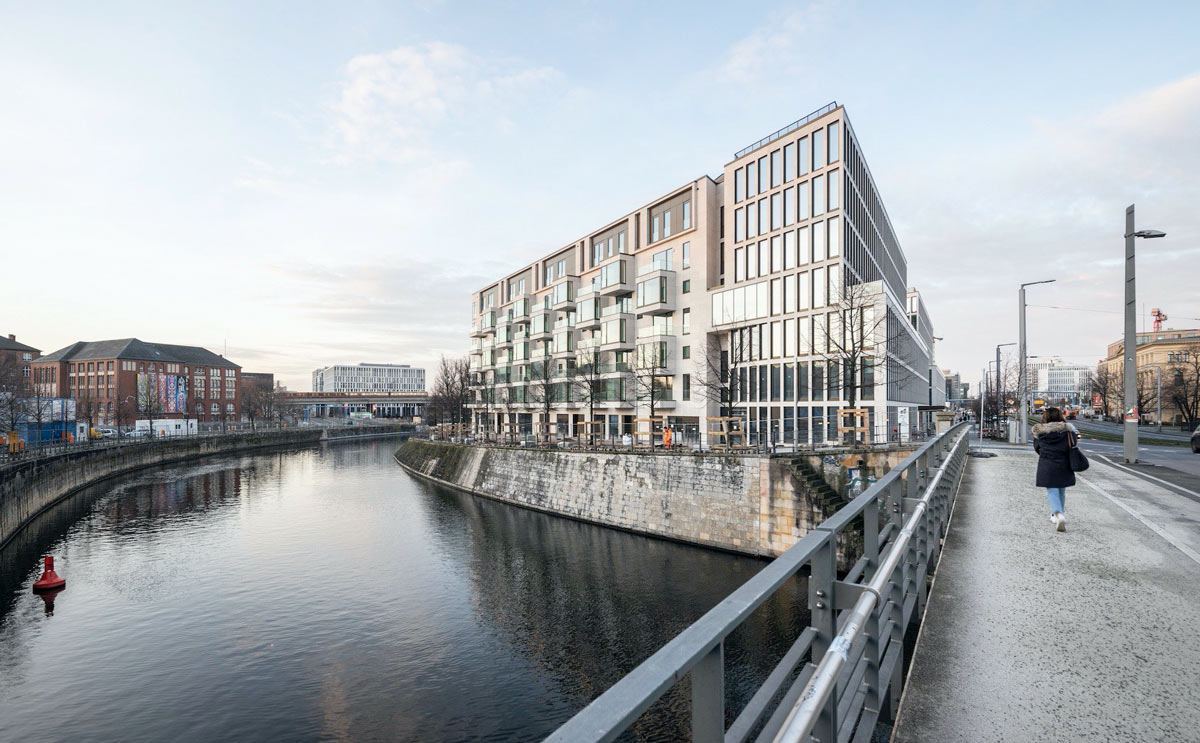 In erstklassiger Wasserlage, direkt gegenüber dem Regierungsviertel, wurde ein beeindruckendes Ensemble, bestehend aus Büros sowie Einzelhandels- und Gastronomieflächen und zum Teil auch Wohnungen, realisiert. Bereits vor Fertigstellung mieteten große Handelsketten wie EDEKA und Rossmann Ladenflächen an. Auch mehrere bekannte Gastronomieketten, darunter L’Osteria und Coffee Fellows, konnten als Mieter gewonnen werden.