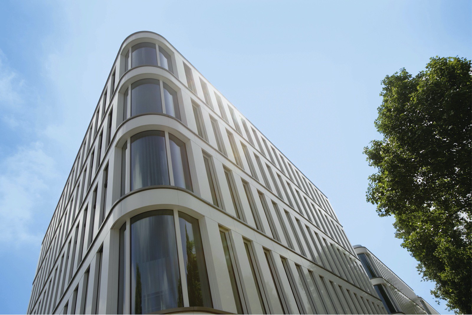 Die weiß glänzende, durch bodentiefe Fenster streng gegliederte Fassade des Bürogebäudes dominiert die Sichtachse entlang der Hansaallee.