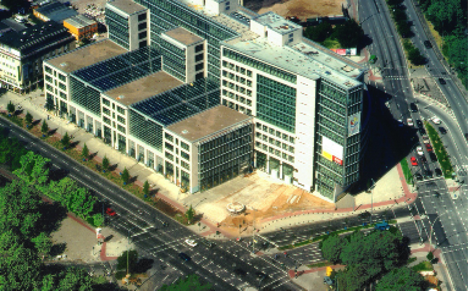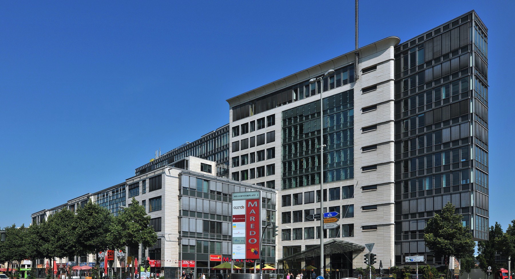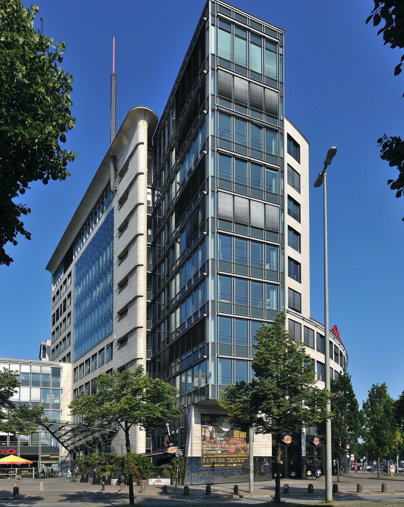The office and commercial building assumes a high-level convenience retail function with its own retail and restaurant space on the ground floor. There are almost 570 spaces in the underground car park, which is a significant advantage in an area heavily frequented by tourists. The impressive and dominant architecture of the building was designed by Hamburg-based architects Kleffel, Köhnholt und Partner. Each of the 1st to 4th floors comprises up to 4,300 m² of lettable space. Since completion, the office and commercial building has been occupied by international companies as their global or German headquarters.