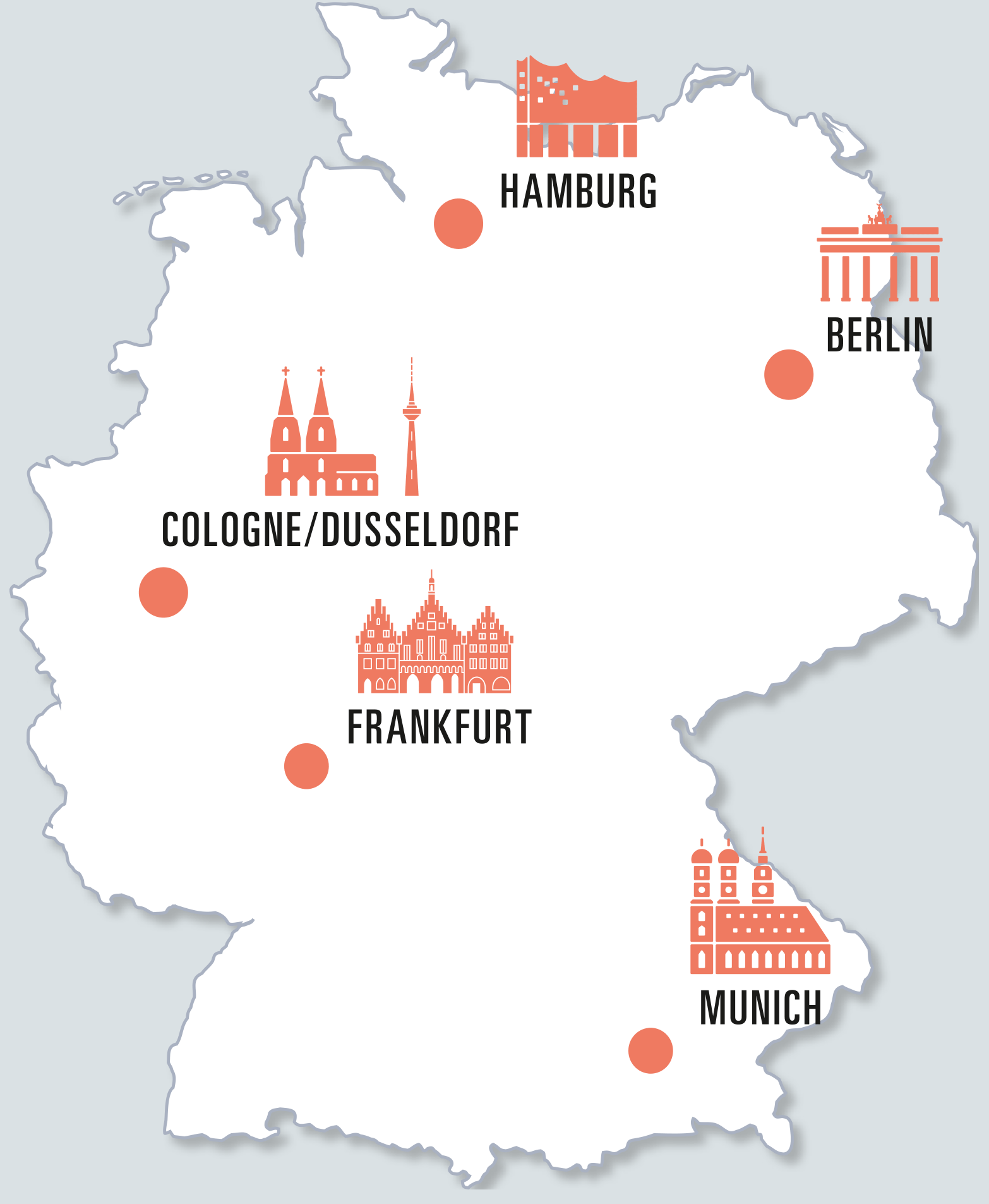 All activities of the ABG Real Estate Group are focused on Germany's top economic locations. With offices in key metropolitan areas, the group ensures swift response times, maximum market coverage, and close, constructive proximity to business partners and clients. Short decision-making paths and strong networking with all key local players enable high levels of dynamism and agility. At the same time, the on-site presence continually opens up new opportunities, interesting synergies, and attractive market prospects. This local presence is a key competitive advantage of ABG.